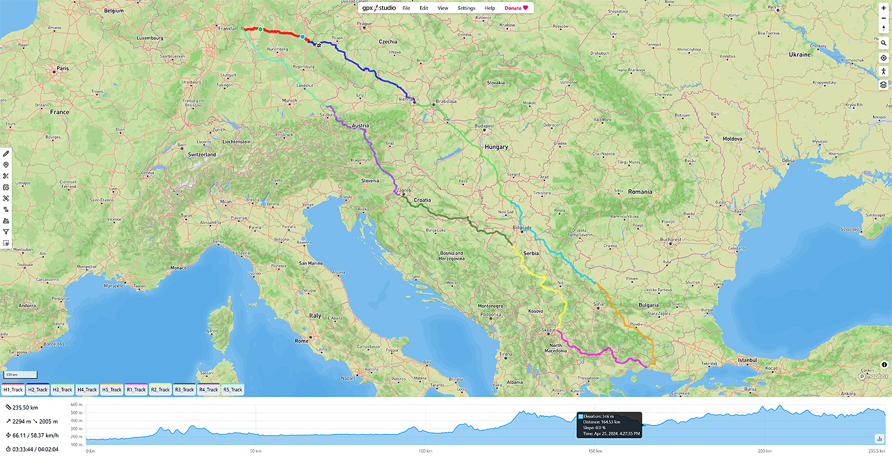 Hier gibt es unzählige Programme, die alle mehr oder weniger gut funktionieren. Zuerst lege ich eine automatisch berechnete Route vom Start zum Ziel. Hier landet man natürlich meistens auf Autobahnen oder Bundesstraßen. Für schnelle Verbindungsetappen ist das in Ordnung, aber wir wollen natürlich Kurven fahren und die Landschaft sehen. Daher ziehe ich mir die Route dann zurecht auf kleinere Nebenstrecken mit möglichst vielen Kurven. Das klappt in der Regel recht gut und da ich mich vorab kaum über die Gegenden informiere, ist immer wieder für Überraschungen gesorgt. Stichwort französische Regionalparks. Ist das Ende der Etappe nicht bekannt, plane ich die Route so, dass die reine Fahrzeit 7-8 Stunden nicht übersteigt und setze mir irgendwo "wo es schön aussieht" einen Endpunkt.