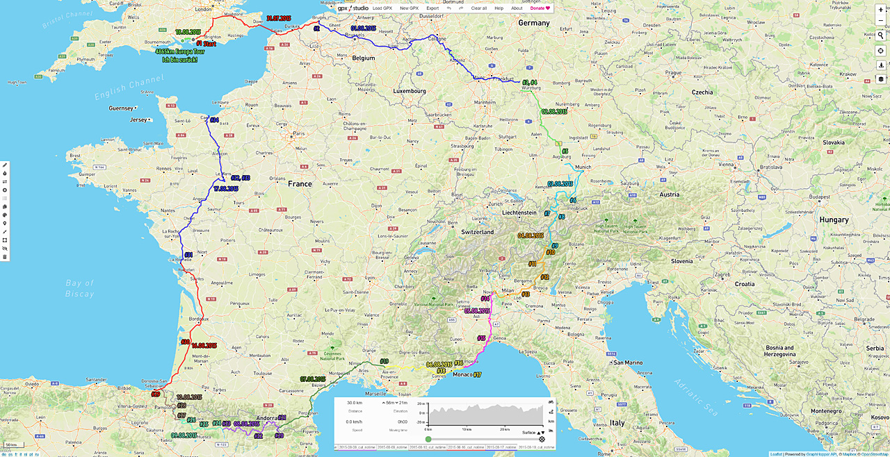Meine erste richtig große Tour, 5000 km quer durch Europa. Start in England, weiter durch Belgien, Deutschland, Österreich, Italien, Frankreich, Monaco, Andorra und Spanien. In der Übersichtskarte sind die jeweiligen Tagesetappen und die Indizes der YouTube Videos zur Tour verzeichnet.