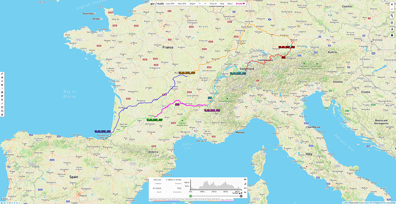 Zuerst sollte man natürlich wissen, wo man hin fahren möchte und ob man auf dem Weg dort hin irgendwelche bestimmten Punkte abklappern will. Für die Euro Tour 2015 hatte ich ein paar Meilensteine. Ich wollte z.B. nach Brügge, in Deutschland meine Familie und Freunde besuchen, in München noch Kamera Zubehör einkaufen, den Passo Stelvio fahren, die Cote d Azur entlang fahren, rein nach Monaco und Andorra. Mein Reiseziel war San-Sebastian. Auf dem Rückweg zur Fähre nach Caen bin ich spontan noch nach Le Mans gefahren. So hatte ich ausreichend viele Punkte, an denen ich mich entlang hangeln konnte. Die Gesamtstrecke von 5000 km sollte ich mit einem frischen Satz Reifen absolvieren können.
